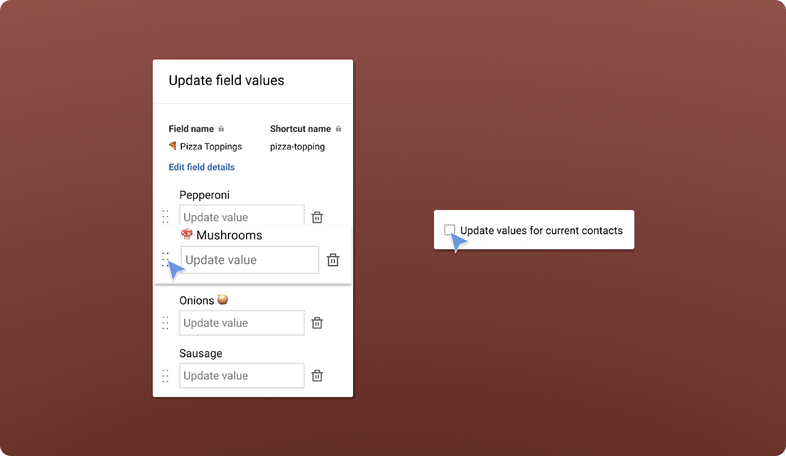 Previously, when you edited field values (like rewording or deleting options), those changes only applied to new contacts going forward. Now, with Update Field Values, you can apply edits to all existing contacts, ensuring cleaner, more consistent data for segmentation and personalization.
